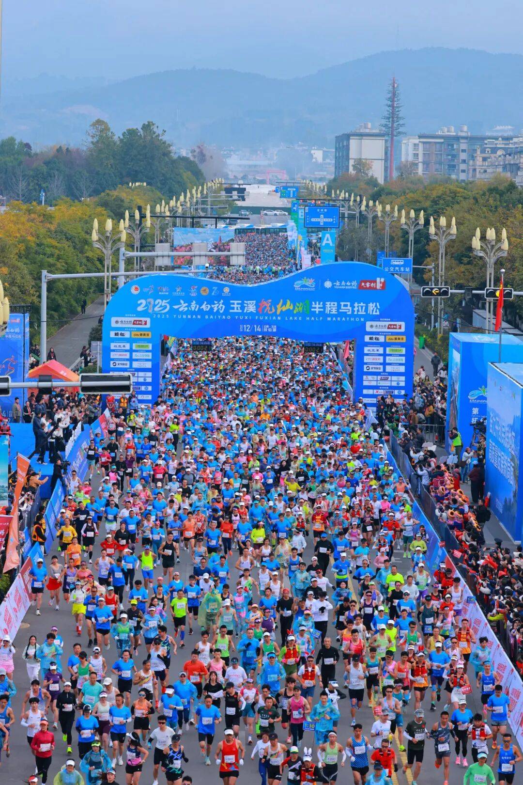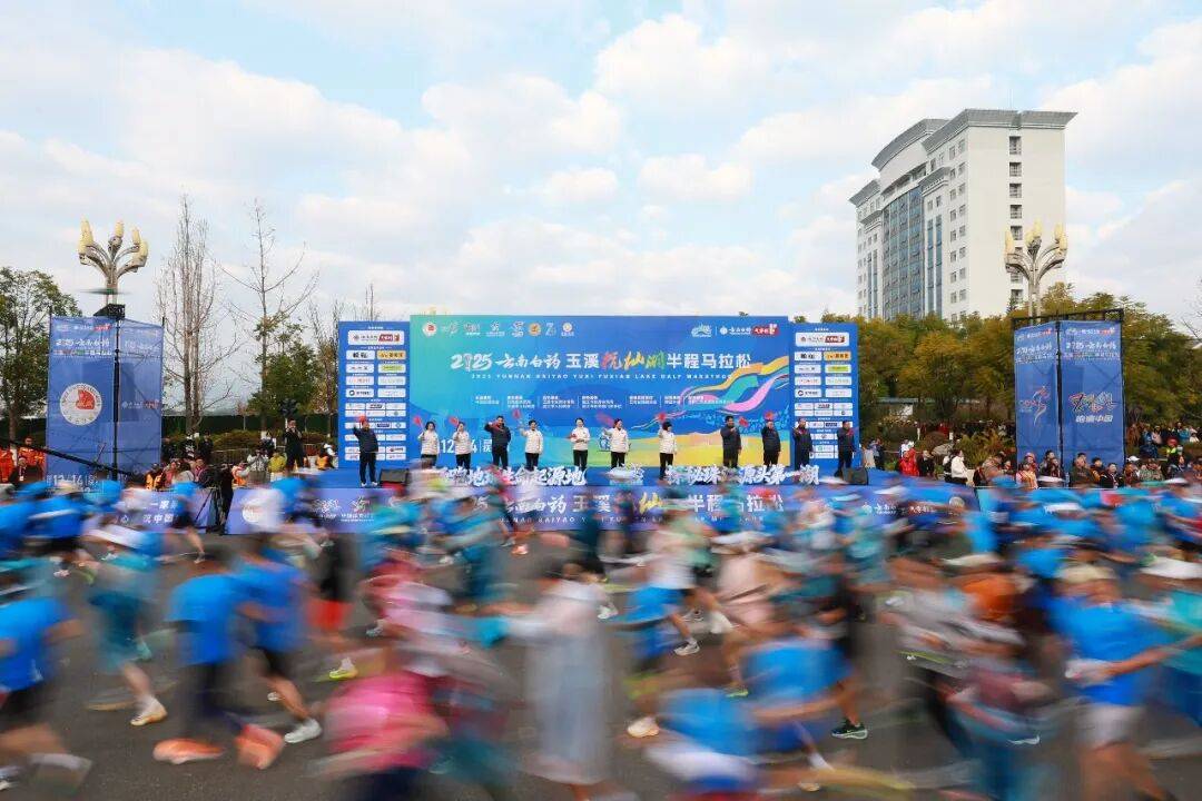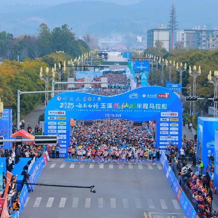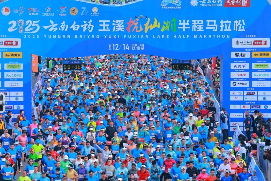 12月14日,伴随着发令枪响,2025云南白药玉溪抚仙湖半程马拉松在玉溪市澄江市鸣枪起跑。这场集竞技、人文、生态于一体的体育盛宴,正以“高原明珠”抚仙湖为卷,21.0975公里赛道为笔,在冬日暖阳下绘就一幅“山灵、湖秀、城美”的立体长卷。