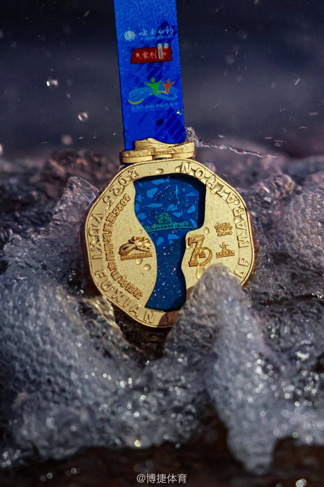 本次赛事完赛奖牌“波澜”,以抚仙湖为灵感核心,延续“波澜起伏”动态造型;正面融入赛事logo与水生生物元素,背面通过流沙“湖底秘境”、7周年专属标识,结合砂质感,从湖光、生命、历史、赛事纪念多维度,展现抚仙湖自然与人文底蕴,致敬跑者坚持。当选手冲过终点线,这块承载着高原阳光与湖风印记的奖牌,既是坚持的勋章,更是对抚仙湖生态之美、人文之厚的永恒致敬。
