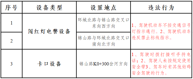 二、设置地点及主要抓拍违法行为:(详见附件《交通技术监控设备设置地点及违法行为抓拍类型明细表》)