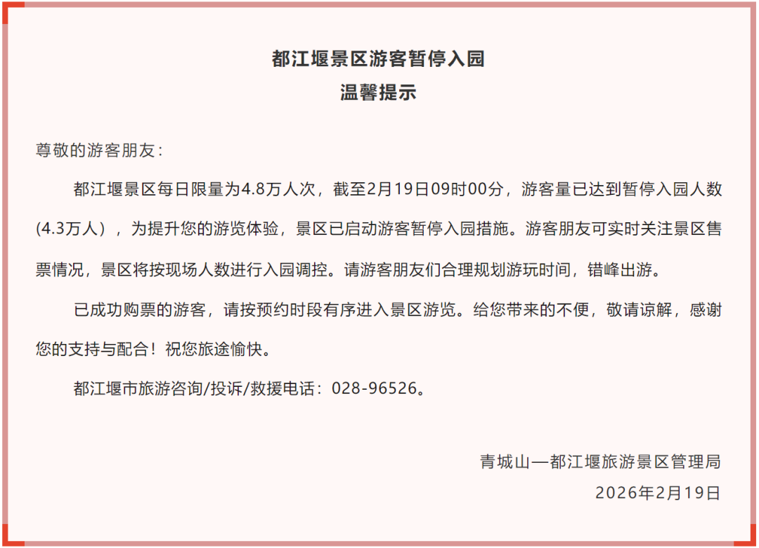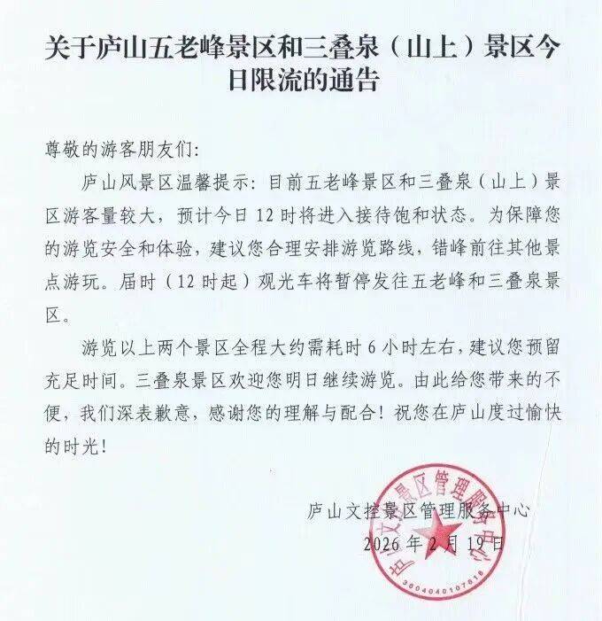 2月19日,多家景区发布公告启动限流措施: