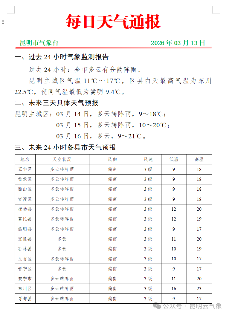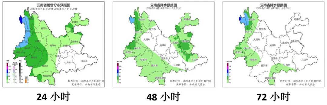 3月13日20时到3月14日20时:怒江州、迪庆州西部、保山市、德宏州、临沧市、普洱市北部、大理州西部阴有中到大雨局部暴雨,迪庆州北部高海拔地区有小雪或雨夹雪,昭通市、曲靖市北部、昆明市北部、楚雄州、玉溪市西部、普洱市南部、西双版纳州、大理州东部、丽江市、迪庆州东部阴有小雨局部中雨,其他地区多云。