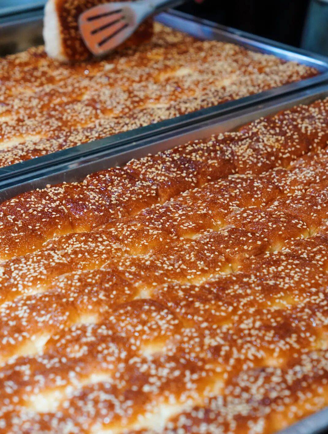 这店生意不错,经常需要排队。店主就在店里新鲜现做,面包出锅还是热乎的,肉眼就能看得出底部的酥脆。