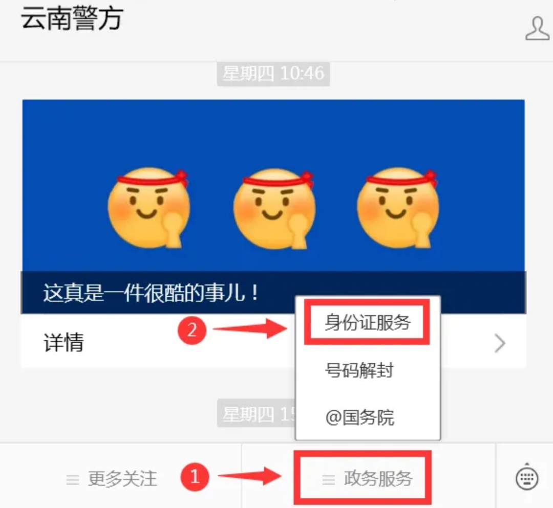 • “云南警方”微信公众号已上线“身份证服务”,提供“在线缴费”“进度查询”两项应用功能,方便群众在办理居民身份证业务时在线缴纳办证工本费,查询制发进度信息。具体操作方法请点击如下链接