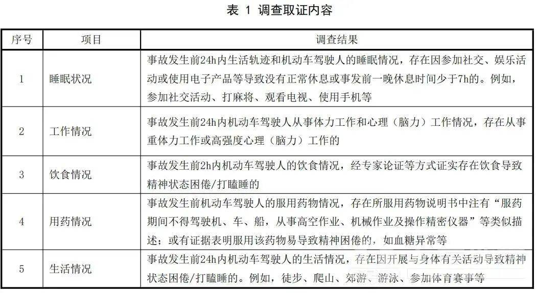 c) 对机动车驾驶人驾驶车辆出发前睡眠状况和工作、饮食、用药、生活等情况进行调查,证实存在表1列举的一项或多项调查结果的。