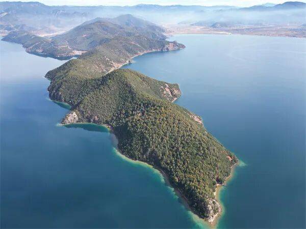 泸沽湖水面如同蓝水晶镶嵌在群山之间
