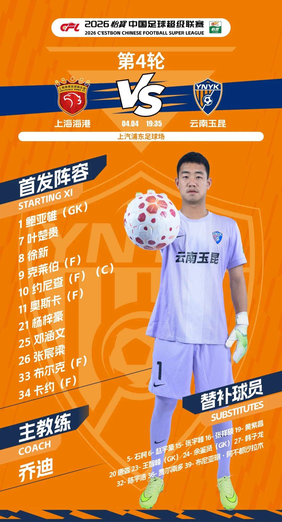 4月4日19:35,2026怡宝中超联赛第4轮,云南玉昆远赴上海上汽浦东足球场,客场挑战上海海港。