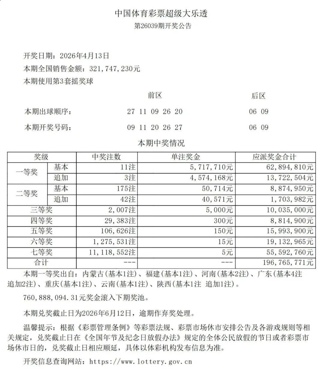 据云南体彩消息,4月13日,超级大乐透26039期开奖,云南省楚雄彝族自治州楚雄市鹿城南路乌山巷1号5308005024门店喜中大奖一注,单注基本奖金571万元。