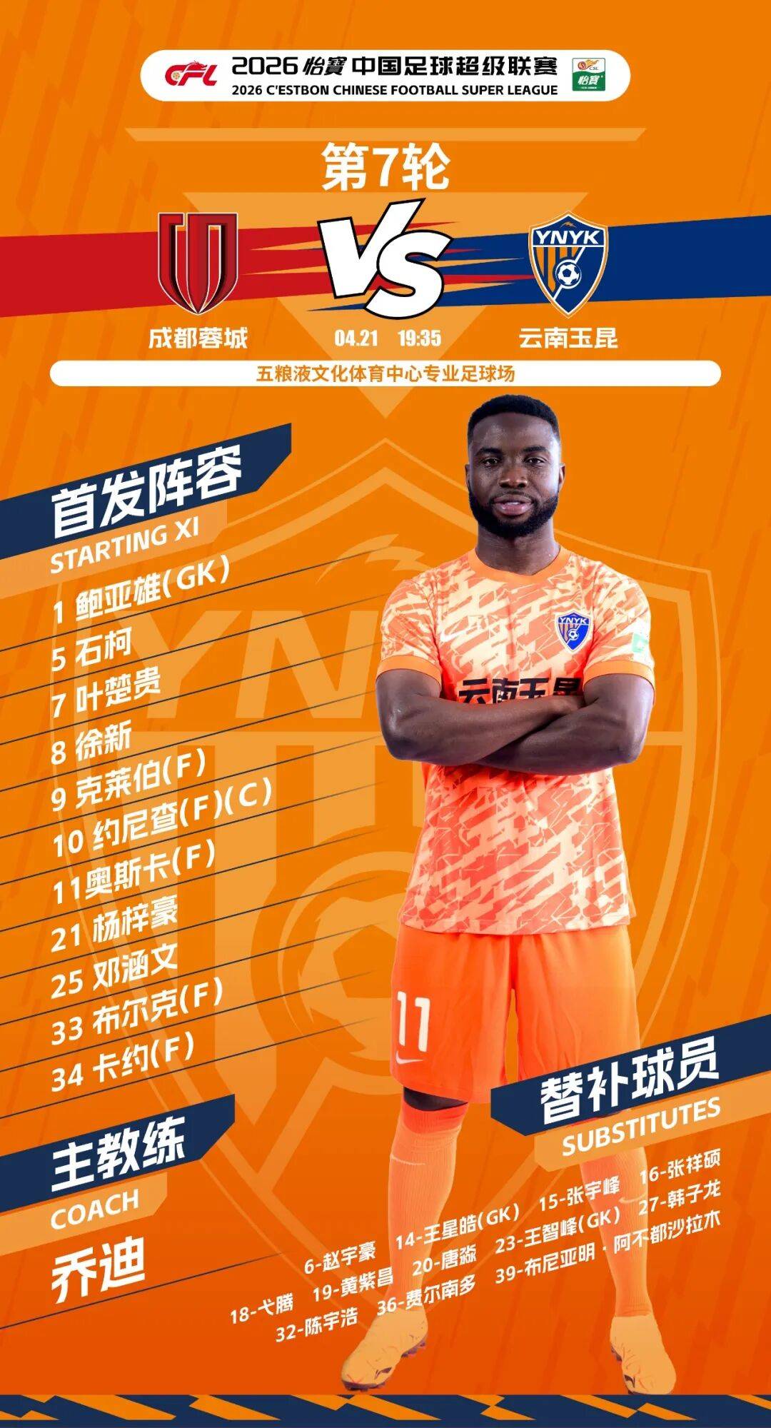 4月21日19:35,2026怡宝中超联赛第7轮,云南玉昆远赴成都五粮液文化体育中心专业足球场,客场挑战成都蓉城。