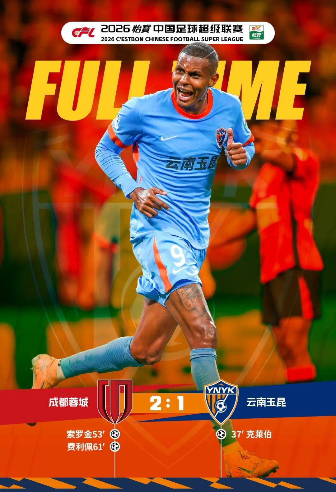 战报·成都蓉城2:1云南玉昆