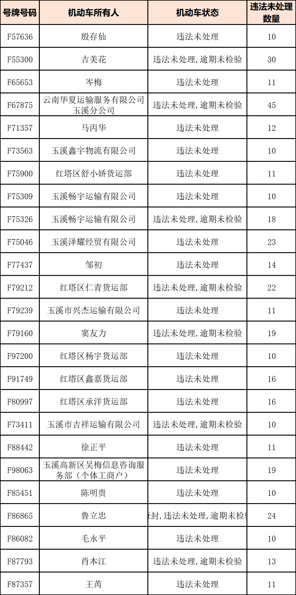上月,全省共查处玉溪籍“两客一危一网”运输车辆交通违法235起,45家企业173辆车上榜。与上月相比,违法数量呈下降趋势(74起)。全市交通违法被查处量较多的企业是:玉溪华泰运输有限公司(34起)、玉溪玉交客运有限公司(18起)、玉溪云滴汽车服务有限公司(含分公司)(36起)、玉溪新能源汽车推广发展有限公司(30起)。请各企业继续加强行业管理,强化安全教育,消除安全隐患,并及时处理交通违法。